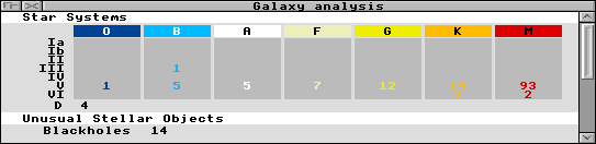 This section displays statistics on all the stars within the Galaxy. The large table splits this information up into Star type, and Size. Details on a particular, type or size, are included in the !Help support.